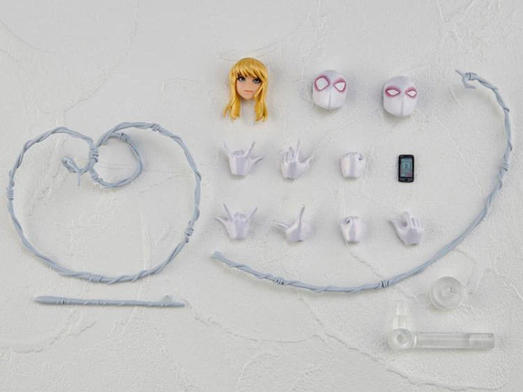 Spider-Gwen gets an Amazing Yamaguchi figure from Kaiyodo, and she looks fantastic! Look at how astonishingly posable she is, and check out the three interchangeable facial expressions (including an unmasked head part), multiple interchangeable hands, and webbing parts–she even comes with her cell phone!Â